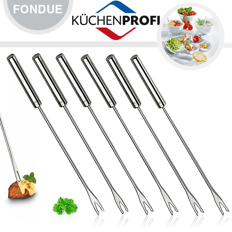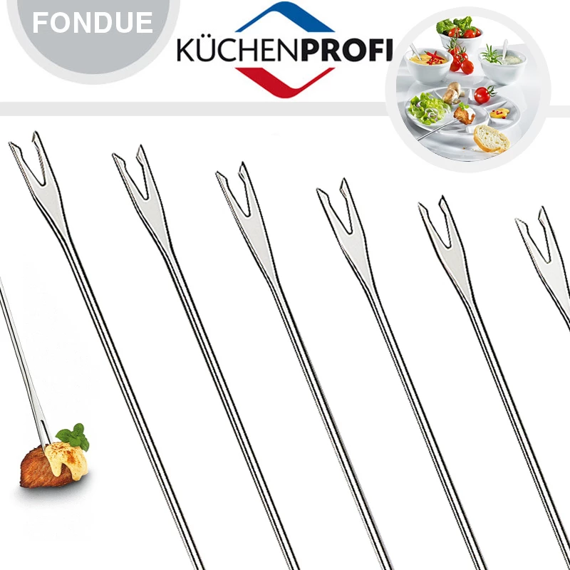 Siehe unten! Wenn sich Fleischstückchen am Boden des Fonduetopfes in dunkle Klumpen verwandeln, ist das ärgerlich. Deswegen halten die Fonduegabeln BEEF von KÜCHENPROFI die leckeren Häppchen sicher fest. Zwei scharfe Zinken packen zu, die Gabeln sind lang genug, um genügend Abstand zum heißen Fett einzuhalten. An dem stabilen Griff haben Sie die Gabeln aus unverwüstlichem Edelstahl sicher in der Hand. Perfekt für ein Fleischfondue sind Sorten mit einer kurzen Garzeit wie Rinderhüfte, Rinderfilet, Schweinefilet, Putenbrust oder Hähnchenbrust. Diese werden in mundgerechte Stücke geschnitten.